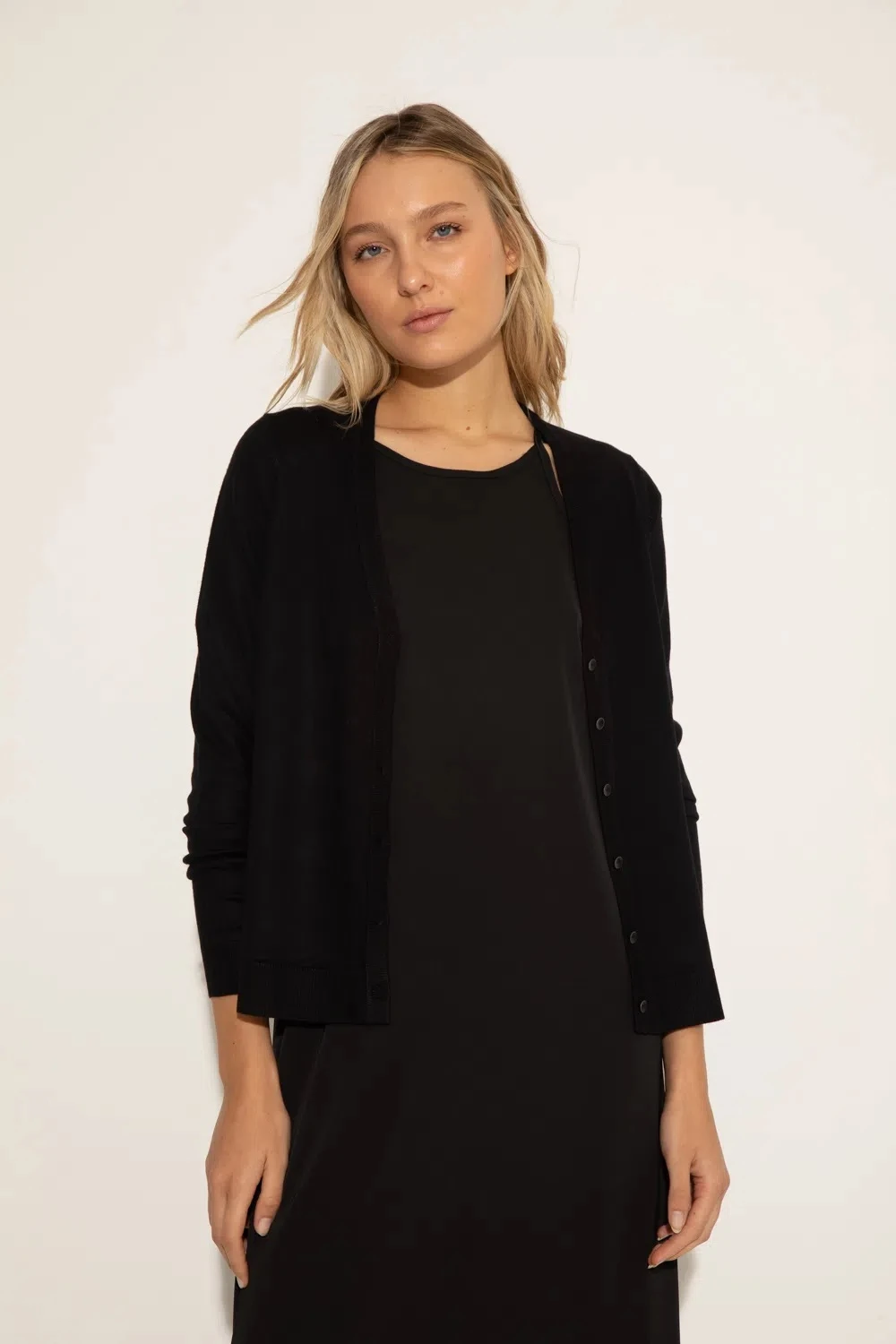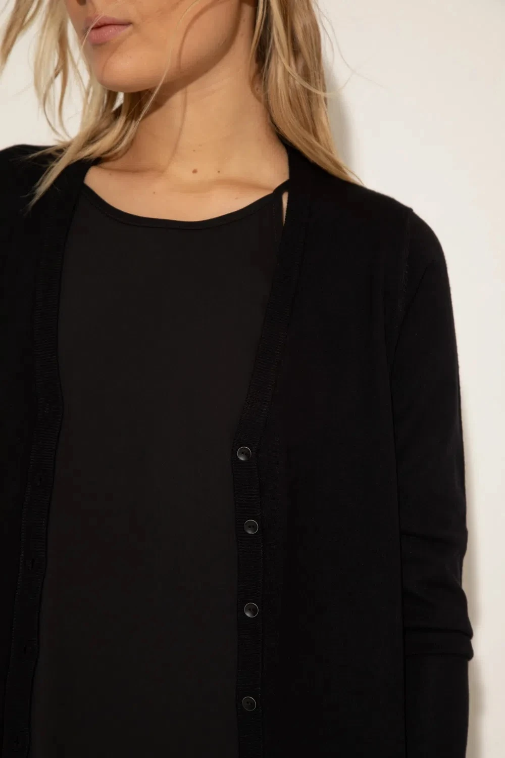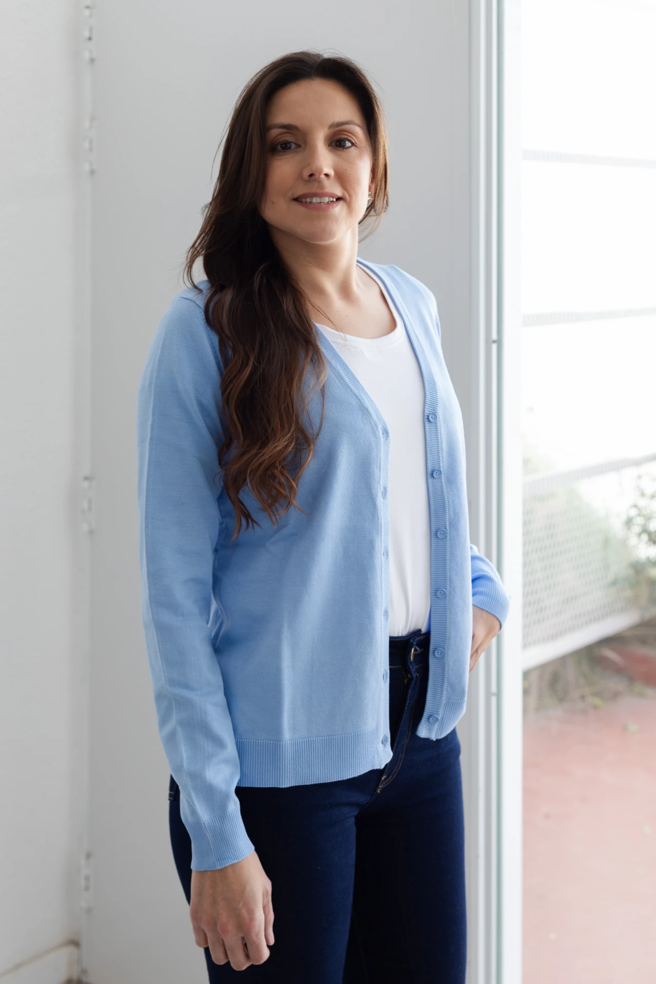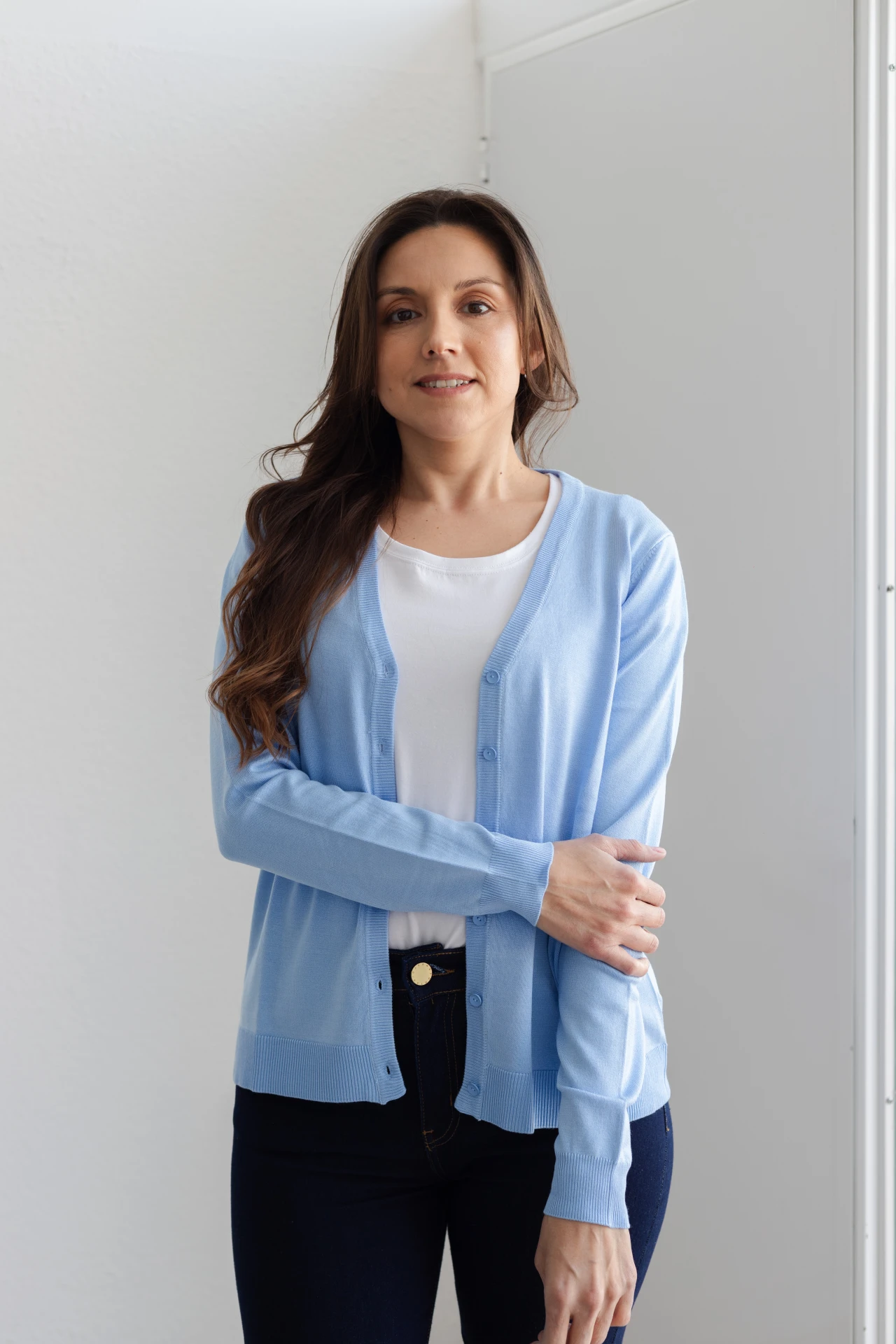 Cardigan de calce básico manga larga y escote en V profundo con botones al tono. De largo modular a la cadera. Tejido noble y sedoso por su gran porcentaje viscoso.