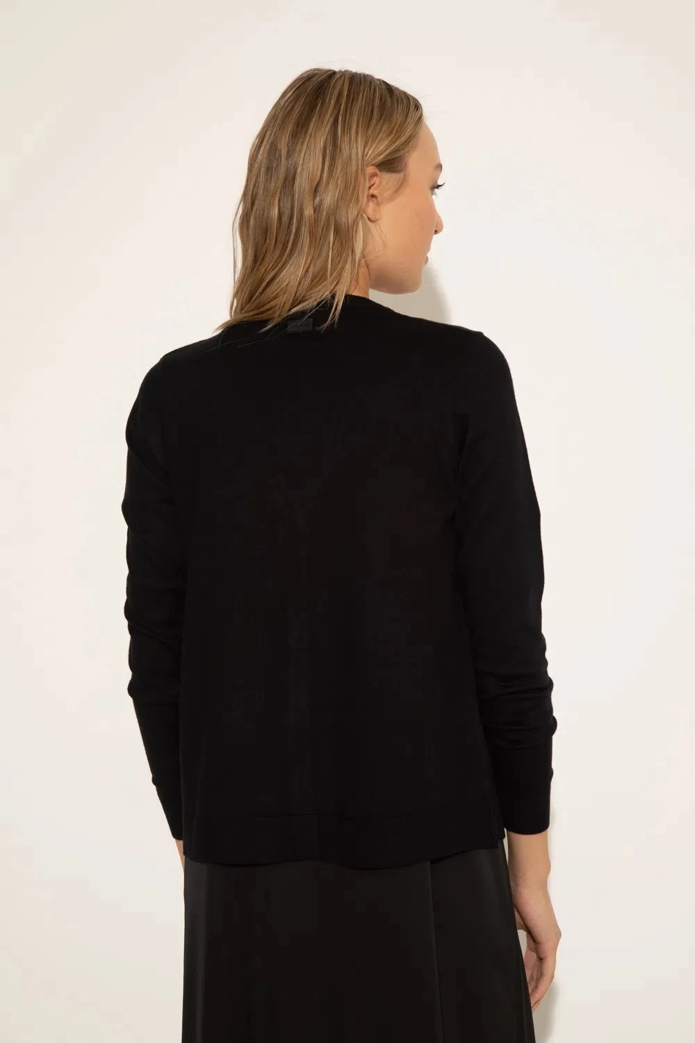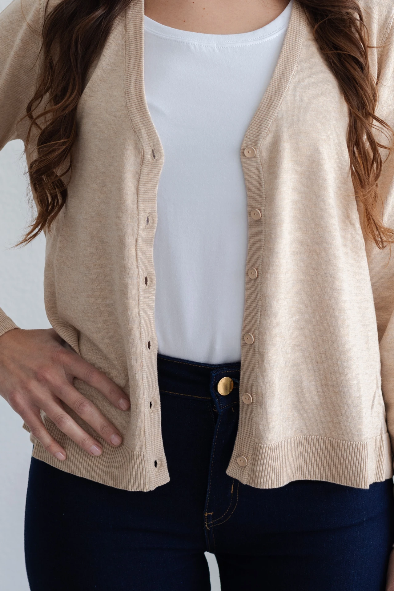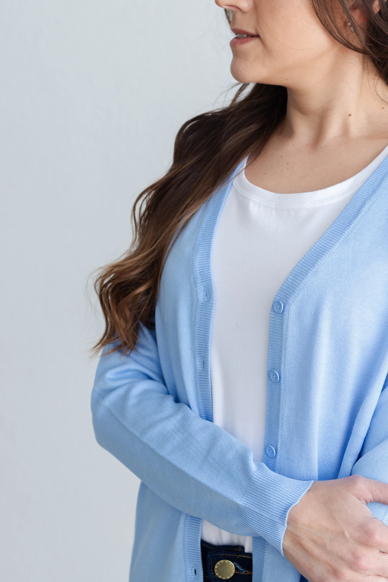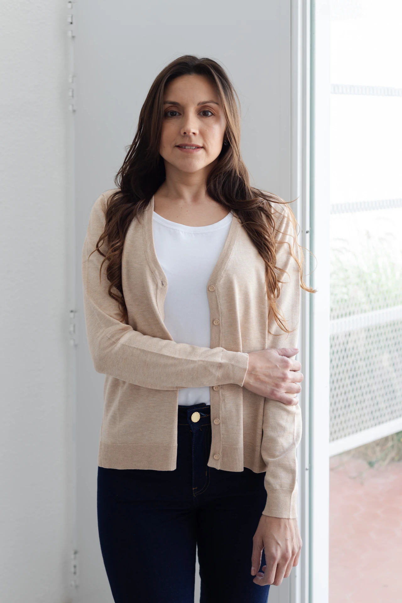 Cardigan de calce básico manga larga y escote en V profundo con botones al tono. De largo modular a la cadera. Tejido noble y sedoso por su gran porcentaje viscoso.
