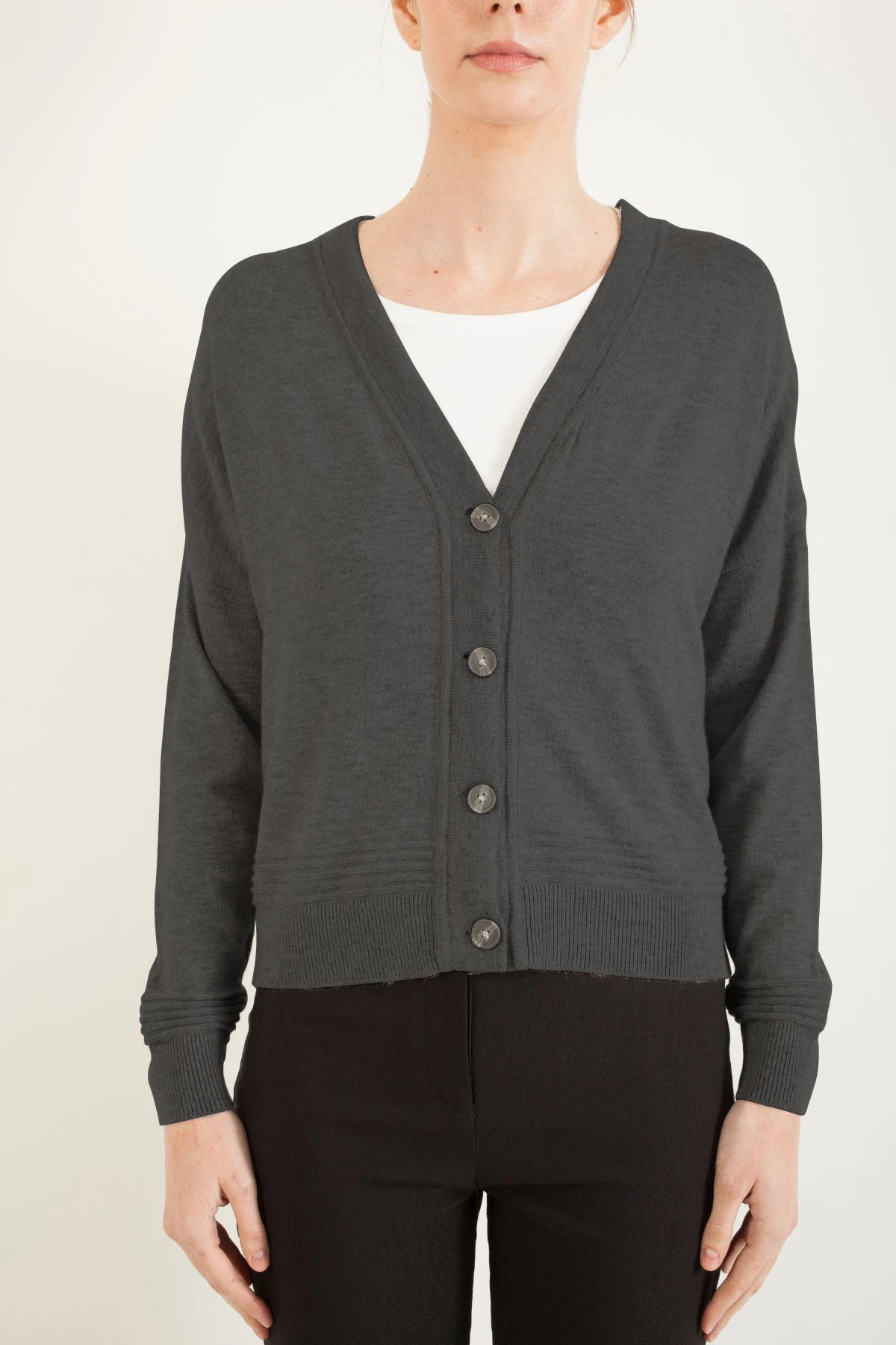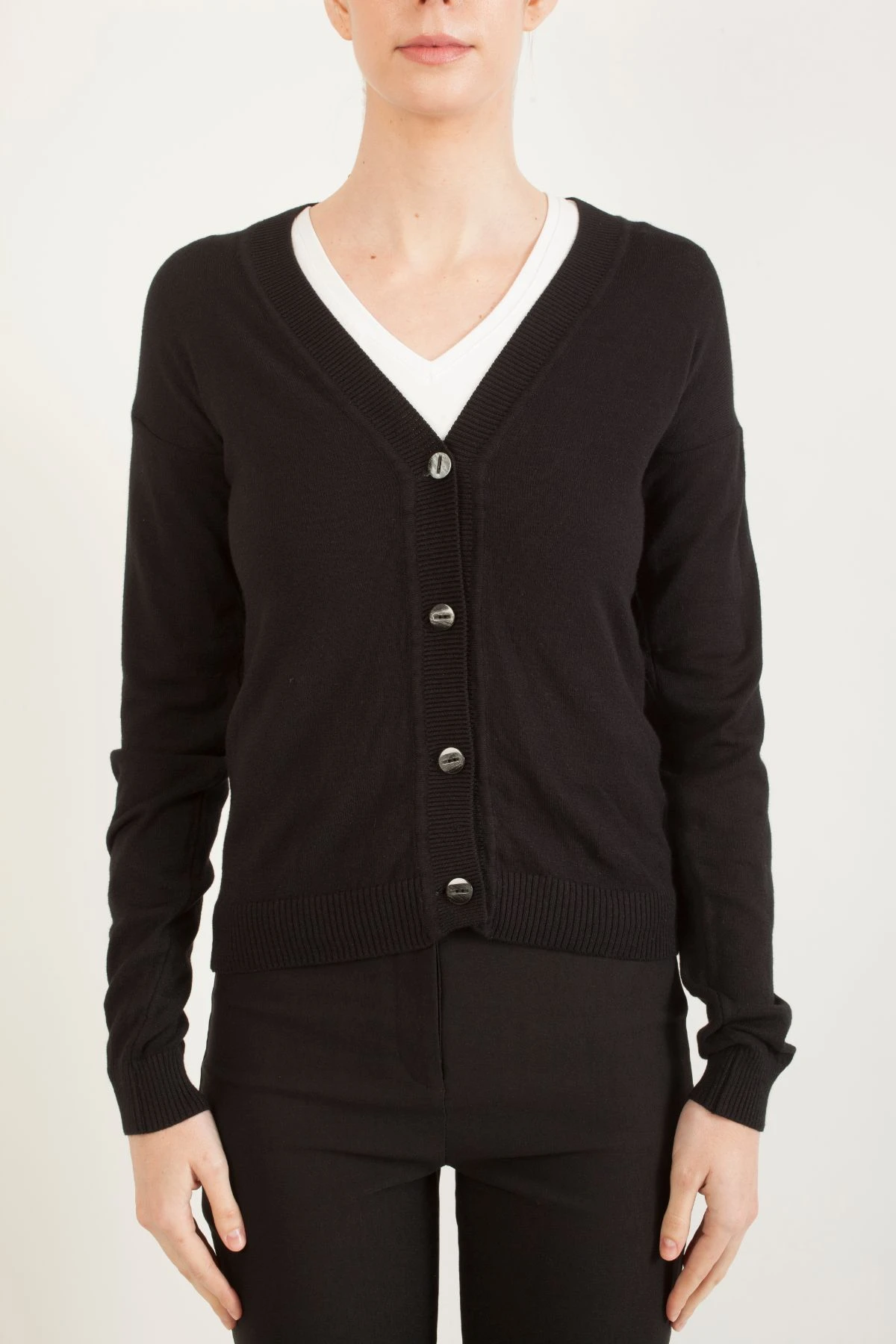 Cárdigan de calce básico manga larga y escote en V profundo con botones al tono. De largo modular a la primer cadera. Tejído noble y sedoso por su gran porcentaje viscosa.