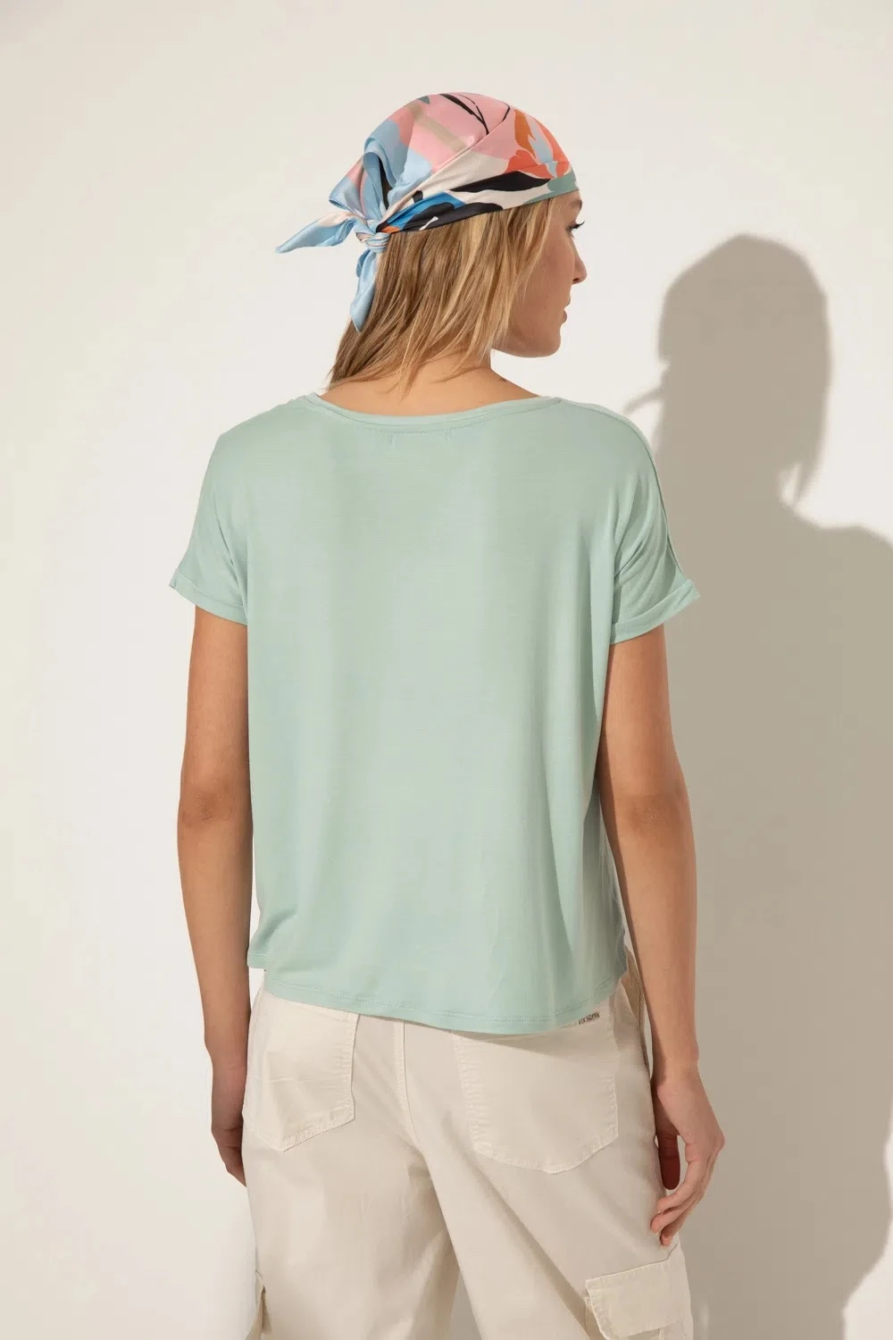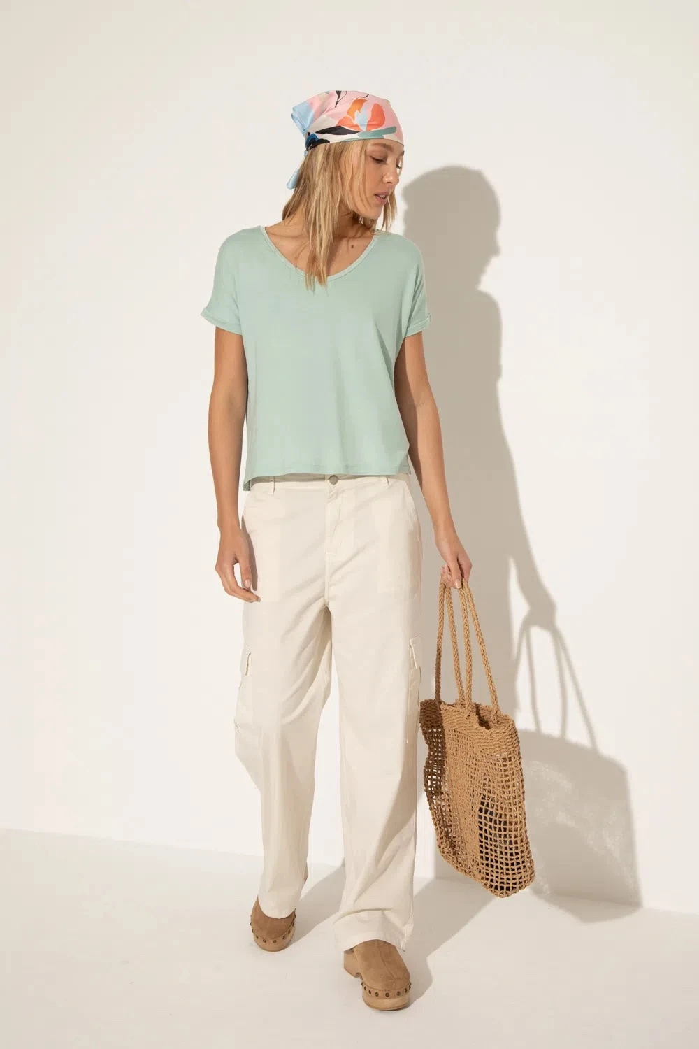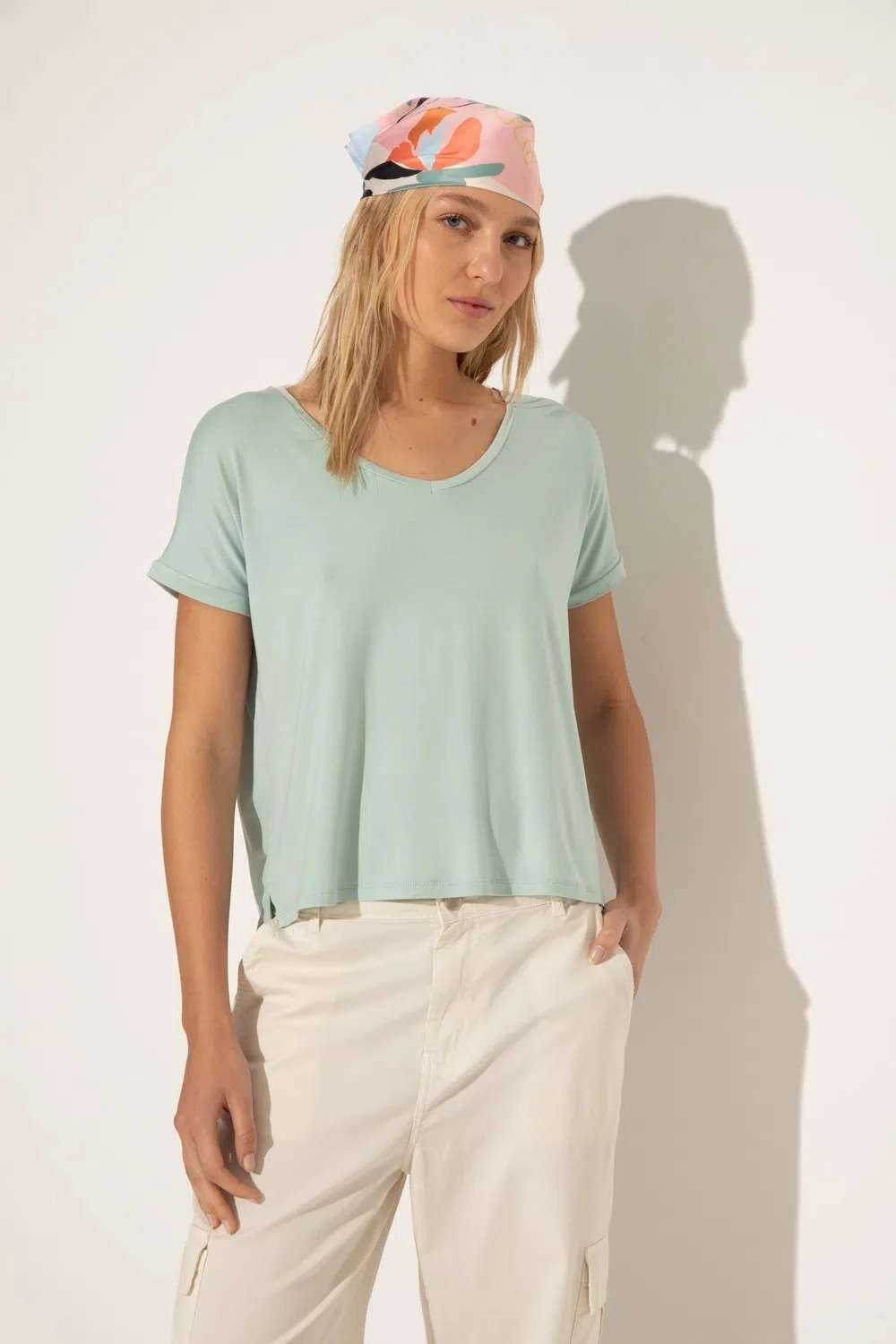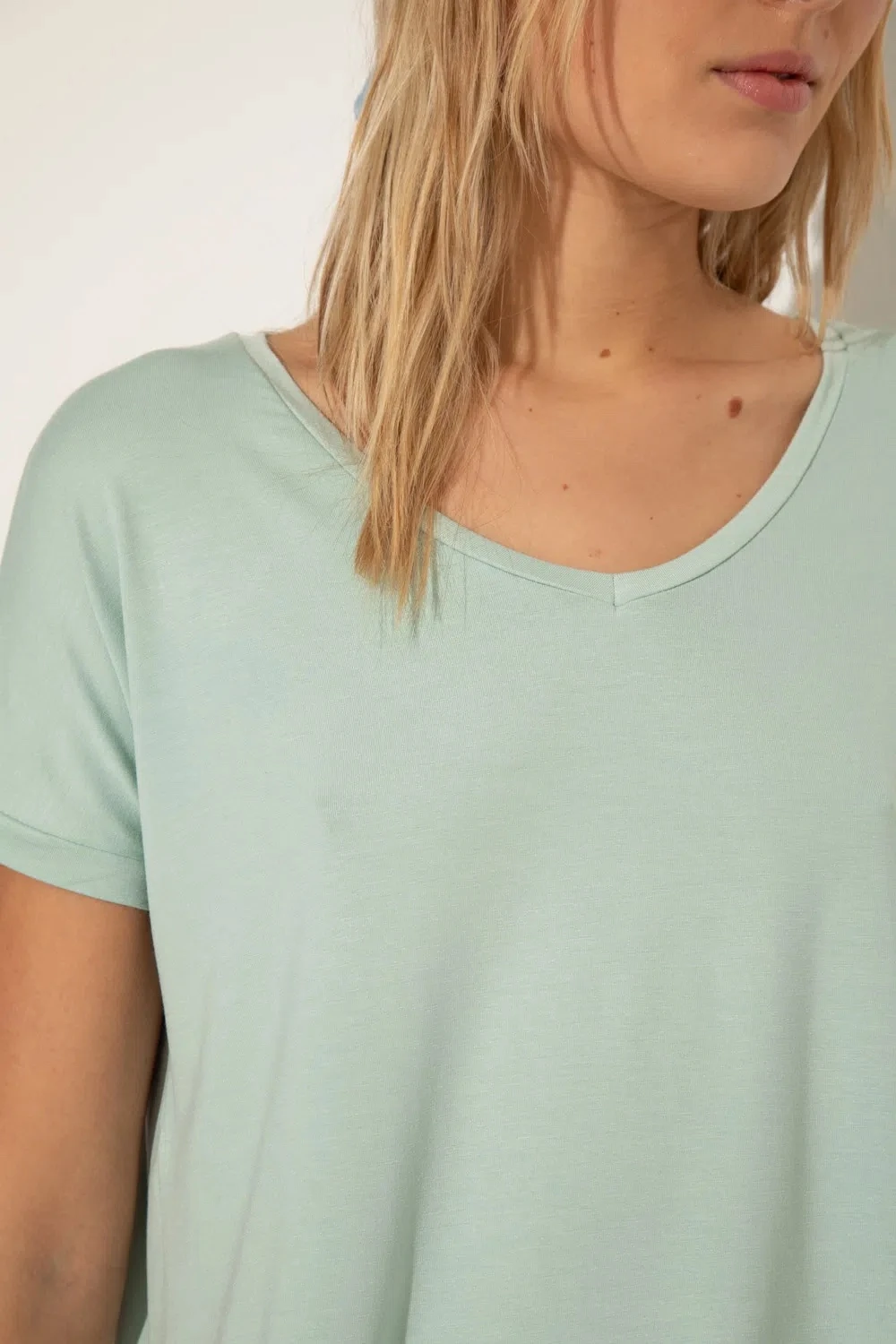 Remera de calce amplio y escote en v. tejido jersey viscosa con elastano.