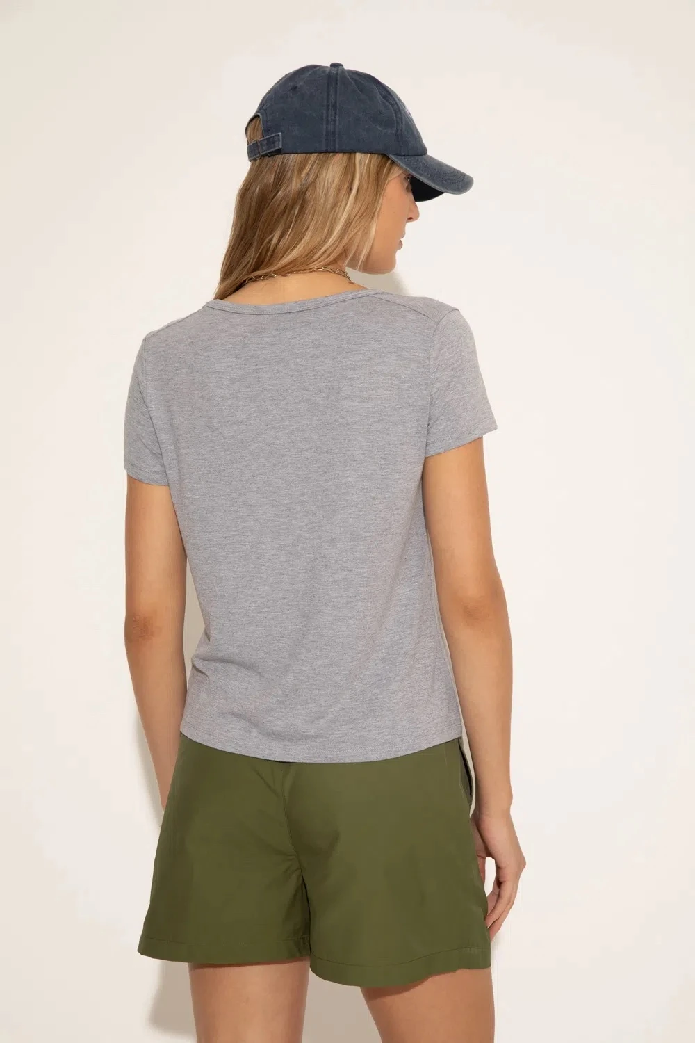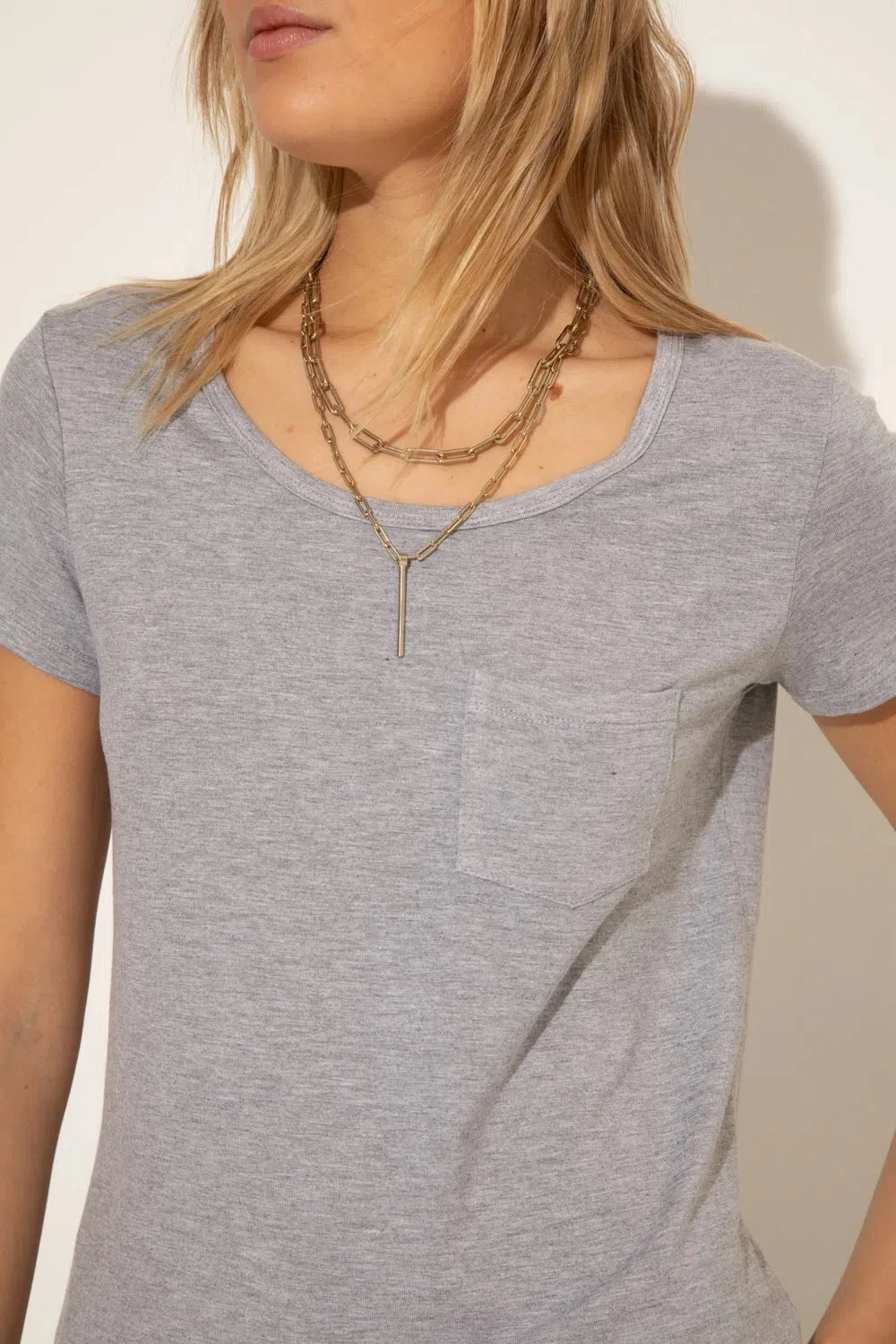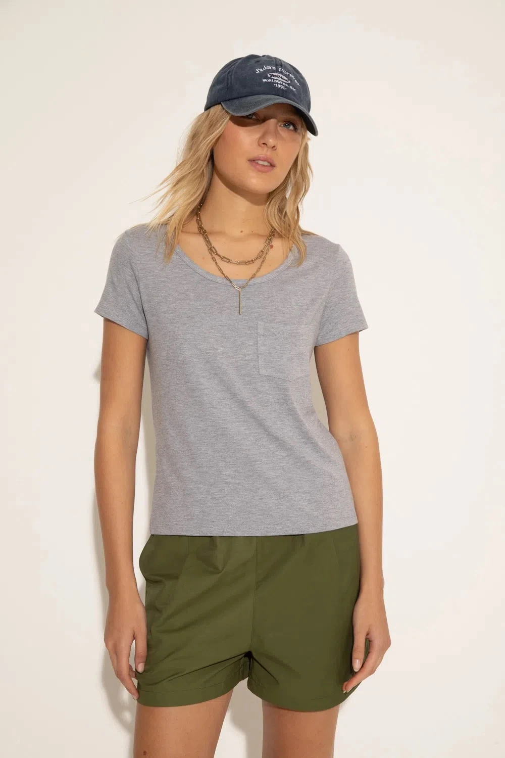 Remera de calce básico y mangas cortas.detalle de bolsillo plaque en tela base en delantero. Tejido de jersey viscosa con elastano.